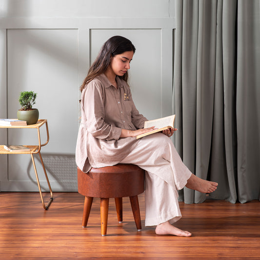 Botanic Fabric Wooden Ottoman in Red Color Set of 2