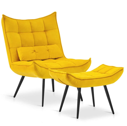 Luxurious Velvet Chair With Ottoman Footrest Yellow