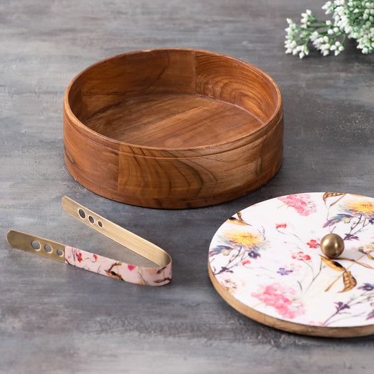 Inscribe Acacia Wood Roti Box with Tong - Floral Silver