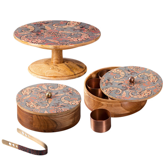 Teakwood cake stand, Chapatti Box & Masala Box Set