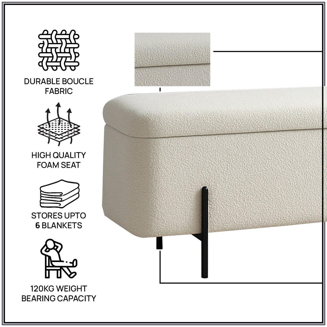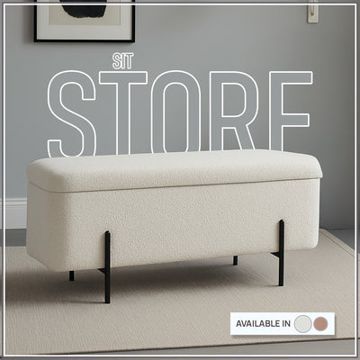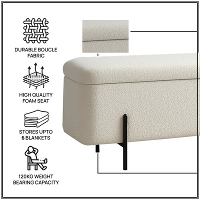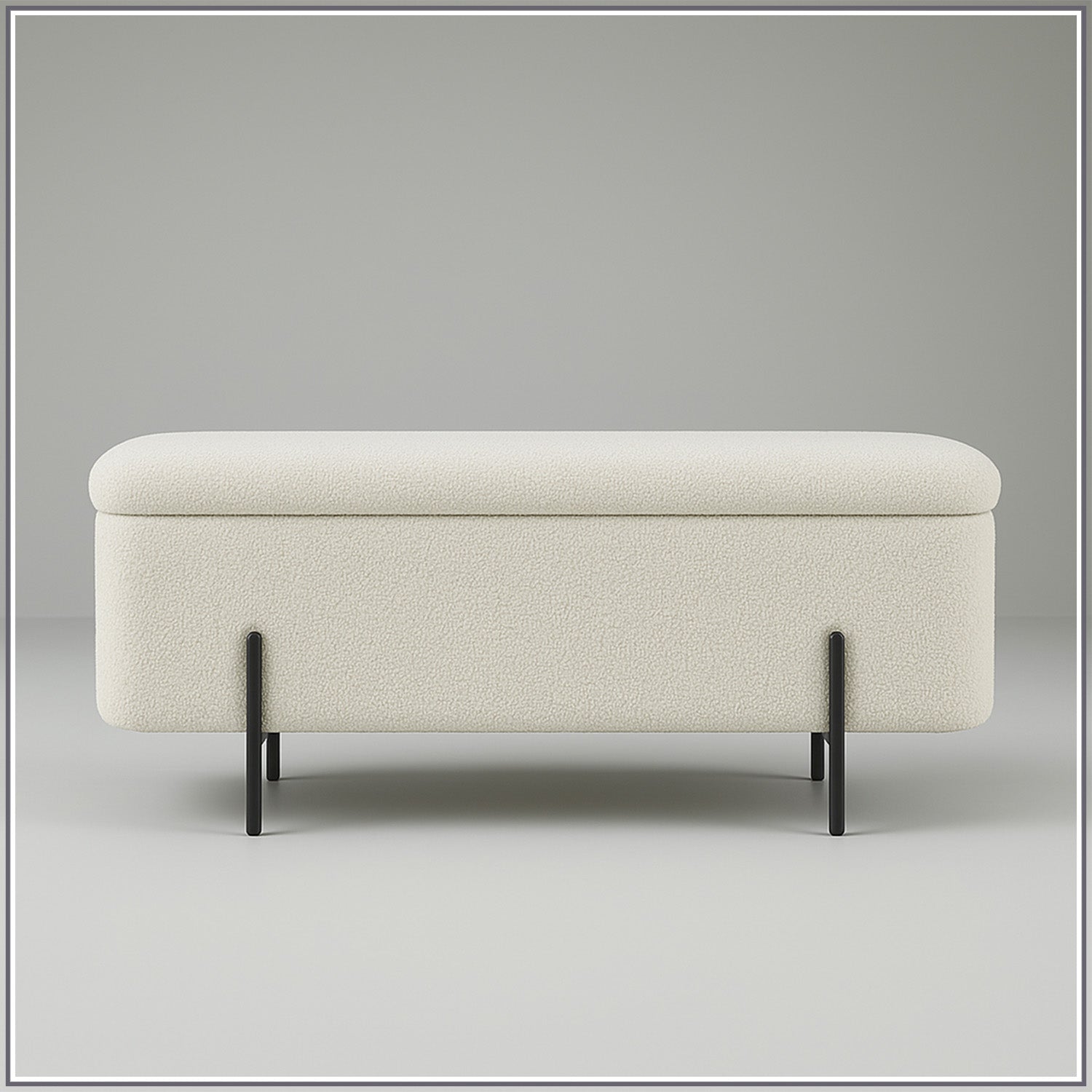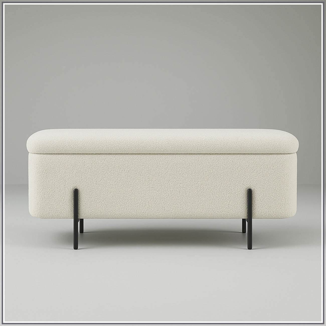 Add a dash of style to your modern space with the Beige Bliss Ottoman Bench With Storage. This plush upholstered boucle lounge bench features a hinged lid that opens to reveal ample hidden storage, ideal for organizing living room or bedroom essentials. Supported by sleek metal legs with metallic caps, its modern design seamlessly integrates into any decor. This versatile beige ottoman bench serves as both seating and storage, enhancing your space effortlessly. Plus, it's easy to assemble, making it a convenient addition to your entryway, living area or bedroom.