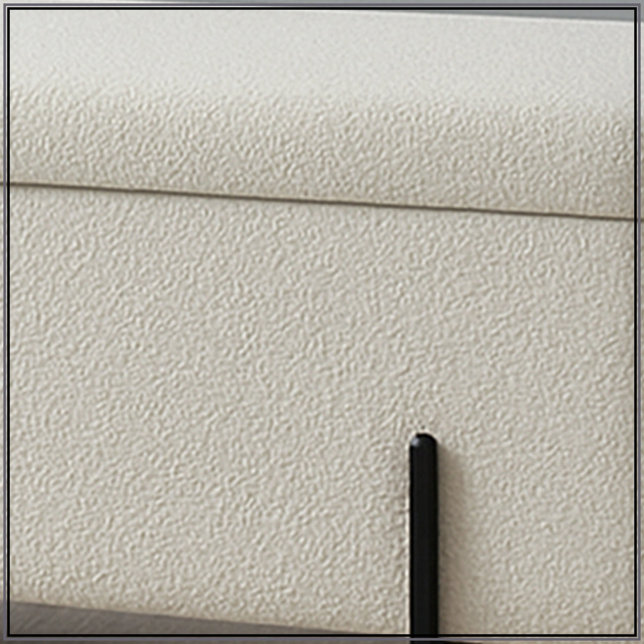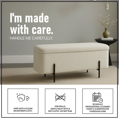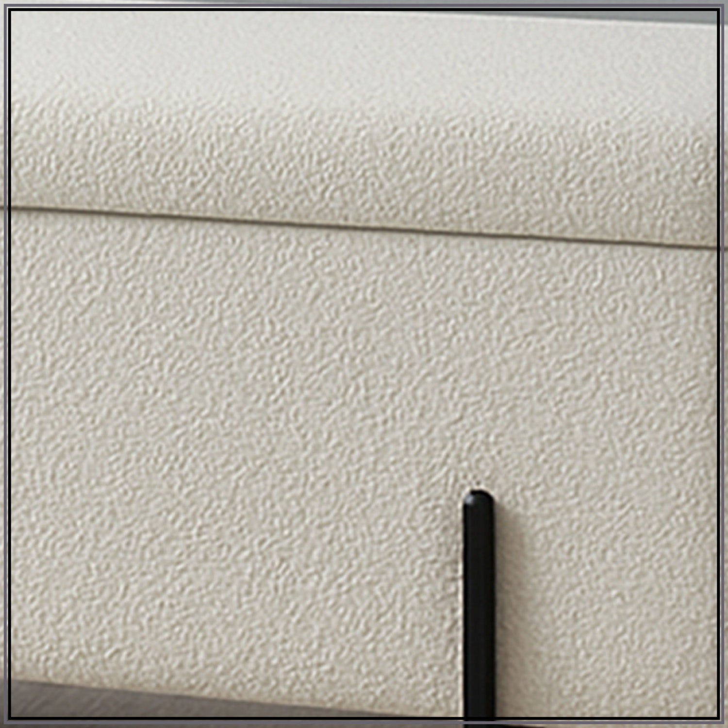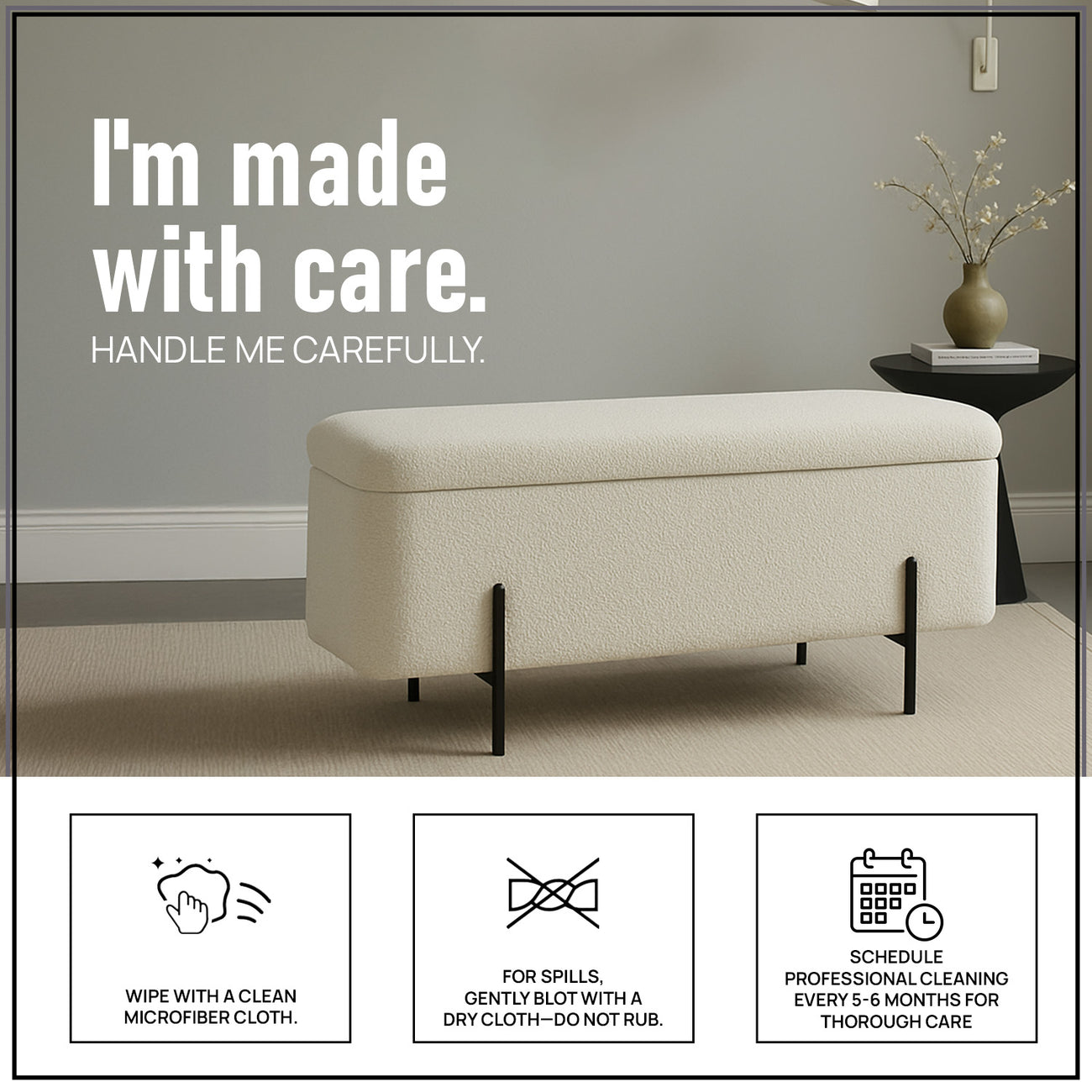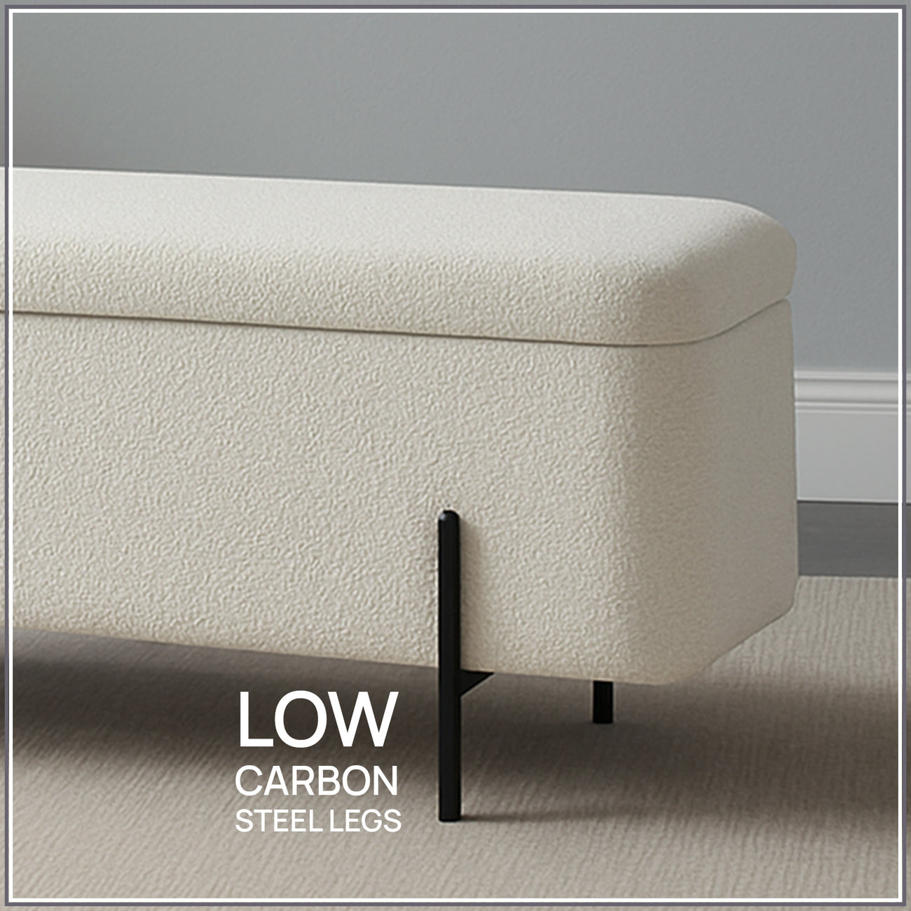 Add a dash of style to your modern space with the Beige Bliss Ottoman Bench With Storage. This plush upholstered boucle lounge bench features a hinged lid that opens to reveal ample hidden storage, ideal for organizing living room or bedroom essentials. Supported by sleek metal legs with metallic caps, its modern design seamlessly integrates into any decor. This versatile beige ottoman bench serves as both seating and storage, enhancing your space effortlessly. Plus, it's easy to assemble, making it a convenient addition to your entryway, living area or bedroom.