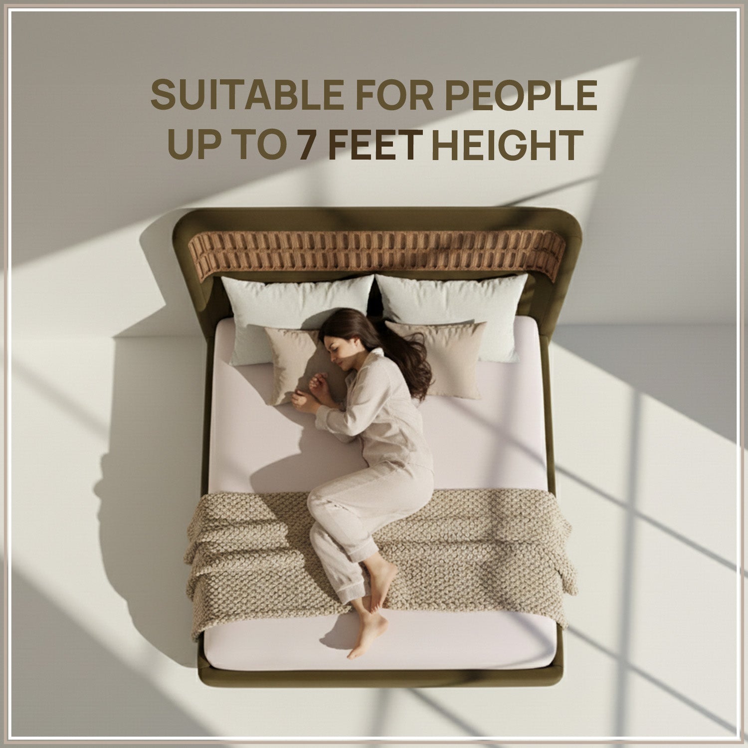 This uniquely designed bed features a non-cushioned solid headboard and footboard with a distinctive textured panel design that adds a premium and artistic character to the bedroom. Crafted with a strong wooden frame and sturdy block-style legs, it offers excellent stability and long-lasting durability. The bed has a clean, open structure with a balanced and contemporary aesthetic, providing reliable mattress support and comfortable sleeping space for people up to 7 feet in height, making it an ideal choice for design-focused elegance and minimal, clutter-free bedrooms.