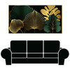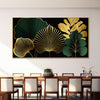 This stunning canvas wall painting features an elegant composition of lush green leaves intertwined with gold leaf on a striking black background. The vibrant foliage and shimmering gold create a captivating visual effect, making it a perfect statement piece for any modern decor. Ideal for enhancing living spaces, this artwork adds a touch of sophistication and nature-inspired beauty to your home or office environment.
