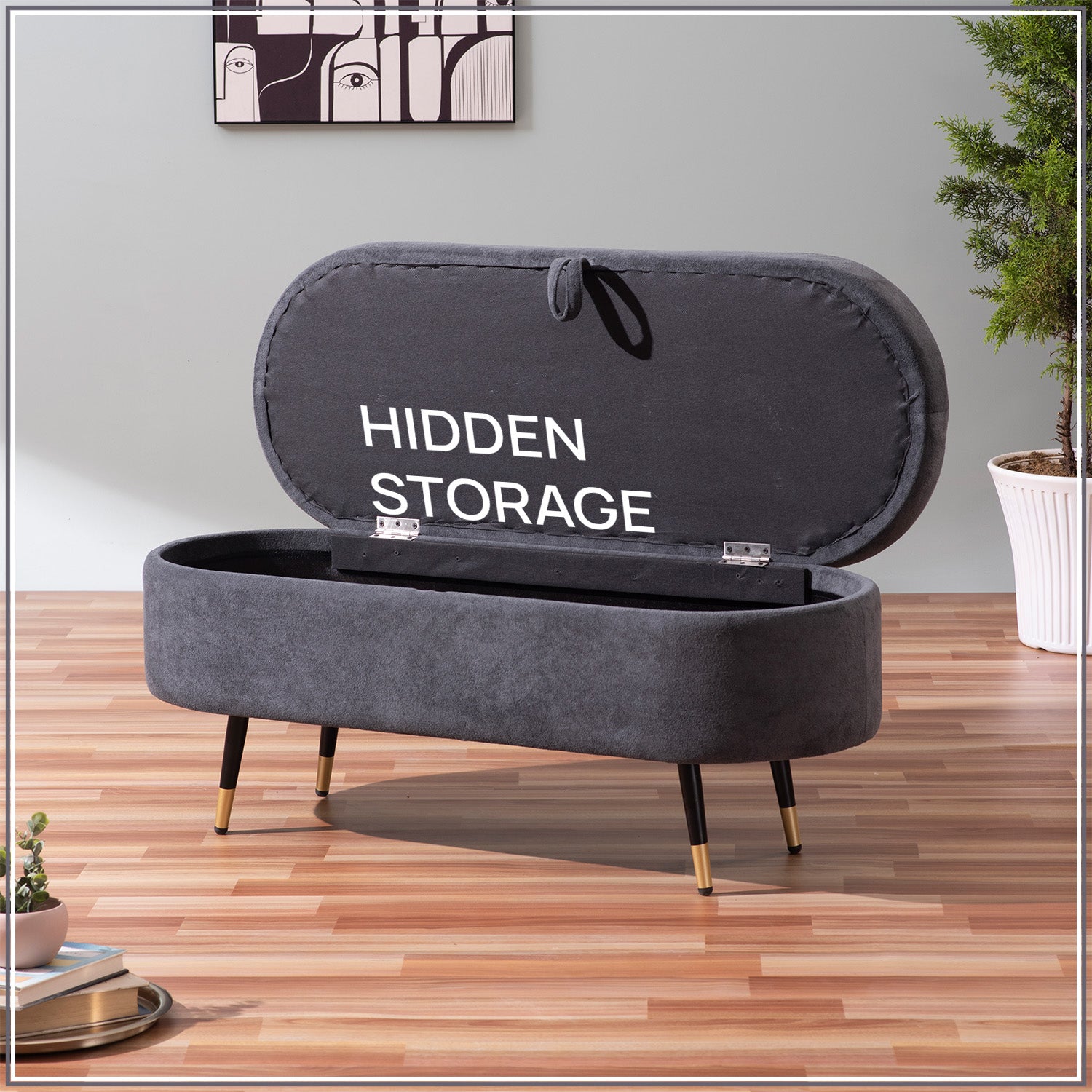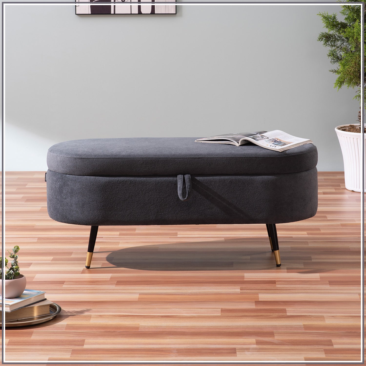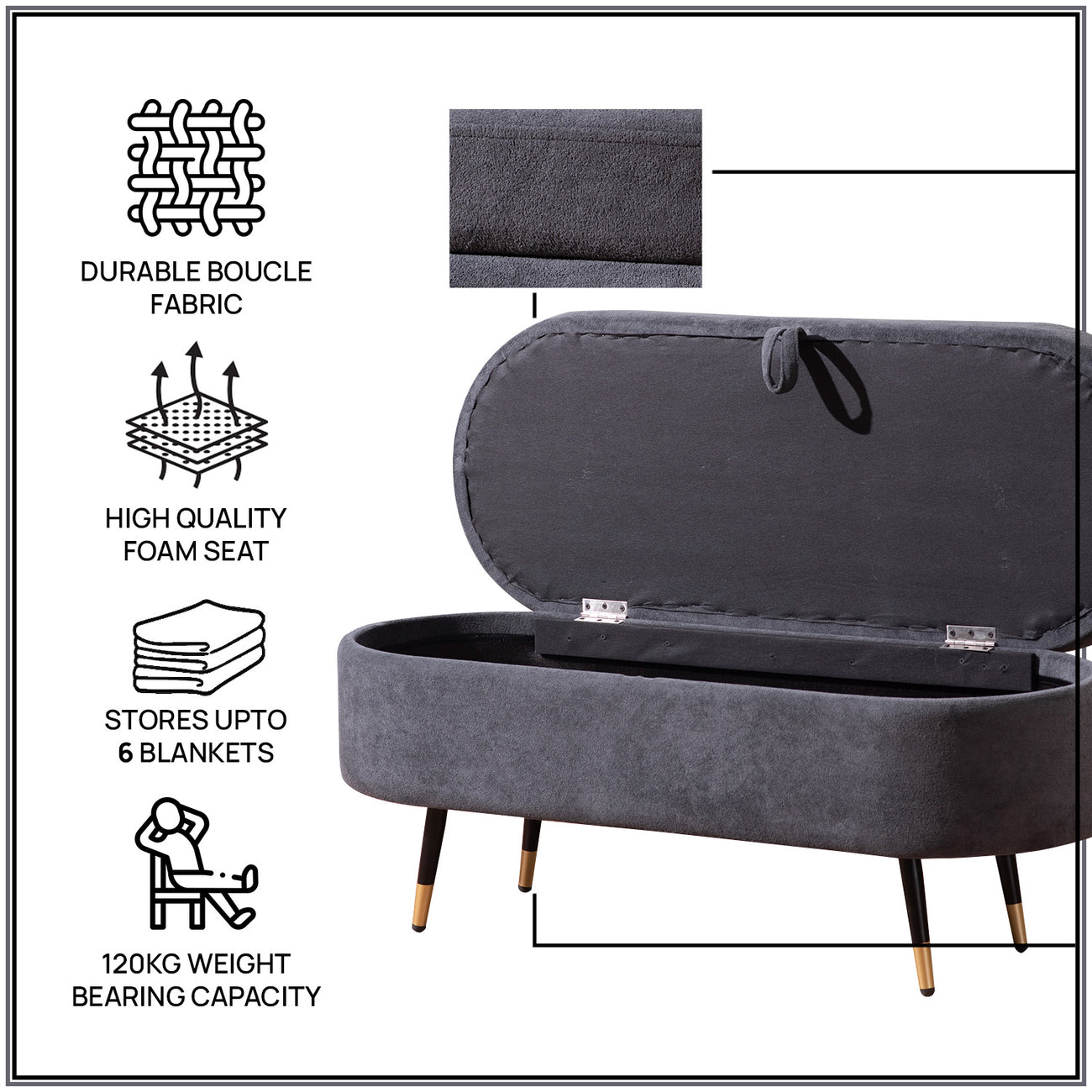 Elevate the aesthetics of your modern space with the Smoky Daydream Ottoman Bench With Storage. This plush upholstered boucle lounge bench features a hinged lid that opens to reveal ample hidden storage, ideal for organizing living room or bedroom essentials. Supported by sleek metal legs with metallic caps, its modern design seamlessly integrates into any decor. This versatile grey ottoman bench serves as both seating and storage, enhancing your space effortlessly. Plus, it's easy to assemble, making it a convenient addition to your home.