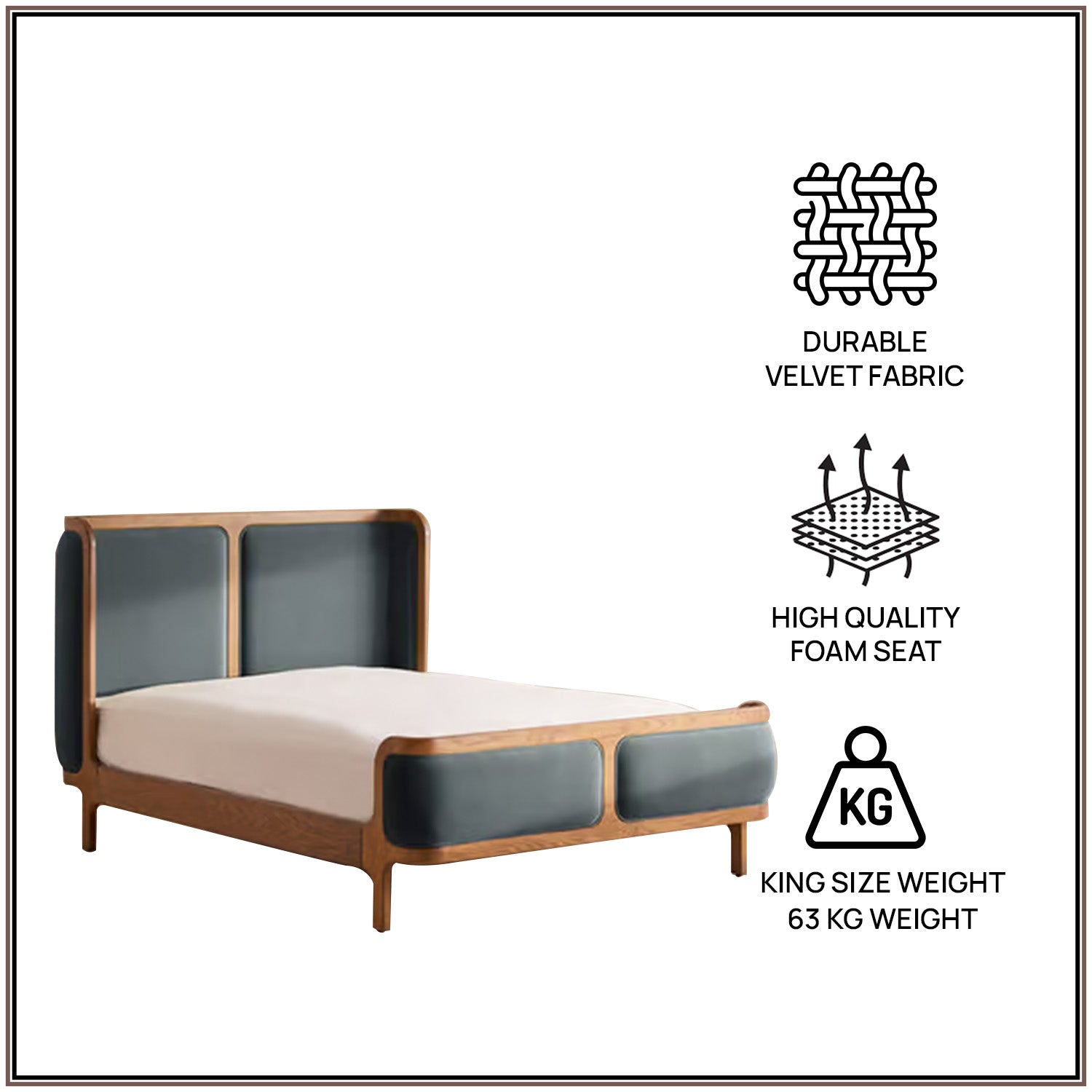 Valerio Duo-Panel Luxe King Size Bed in Grey Blue Velvet with Oak wood Frame & Hydraulic Storage