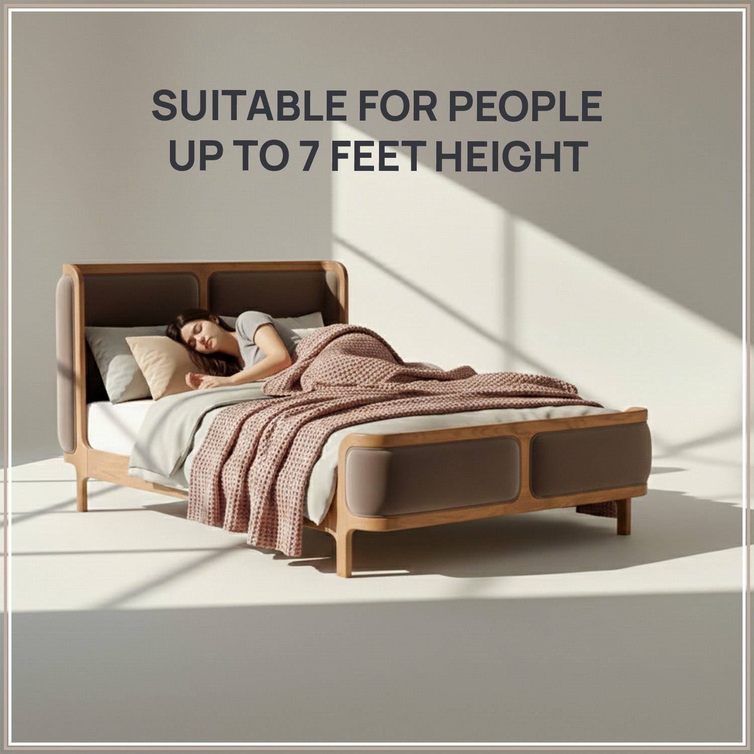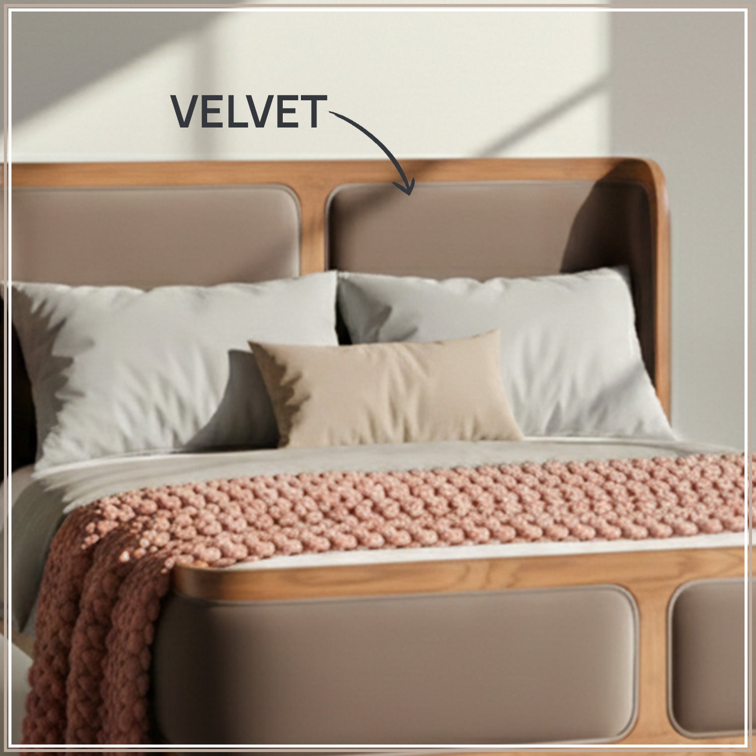 Contemporary and bold in its design language, the Nestroots Valerio Duo-Panel Luxe Bed is crafted to make a refined statement in modern bedrooms. The bed showcases a striking dual-panel upholstered headboard, thoughtfully designed to add visual depth, structure, and sophistication. Its clean geometry and balanced proportions create a strong yet elegant presence, making it an ideal choice for urban and contemporary interiors.Upholstered in rich, premium velvet, the bed offers a soft, plush texture that elevates comfort while enhancing its luxurious appeal. The velvet upholstery contrasts beautifully with the clean-lined oak wood frame, highlighting the craftsmanship and creating a harmonious blend of warmth and modern design. Every detail reflects precision and attention to quality, ensuring both style and durability.